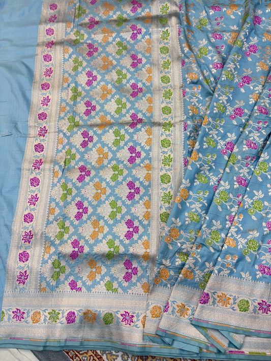 Powder Blue Pure Katan Jangla Banarasi Handloom Saree