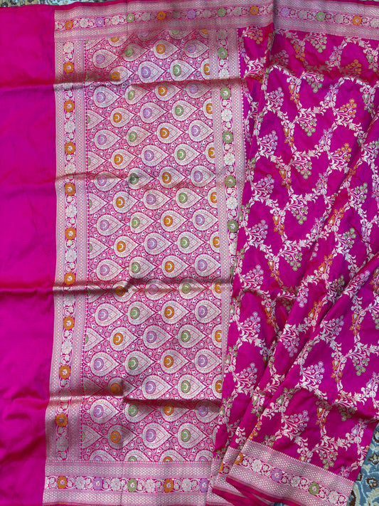 Rani pink pure Katan Jangla Meenakari Banarasi Handloom Saree