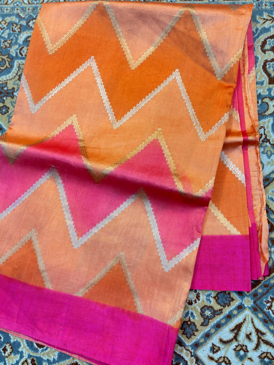 Orang Pink Pure Raw Mango Rungkaat Banarasi Handloom Saree