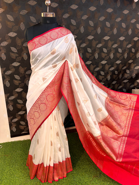 White-Red Pure Katan Kadhiyal Boota Banarasi handloom Saree