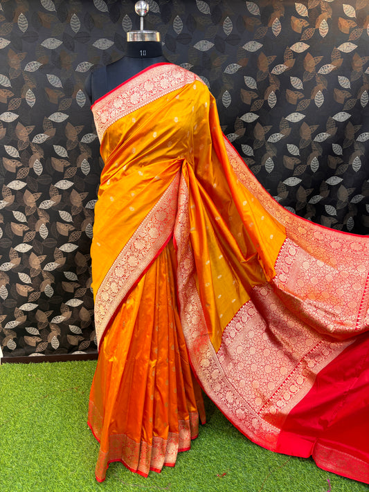 Yellow-Red Pure Katan Kadhiyal Booti Banarasi Handloom Saree