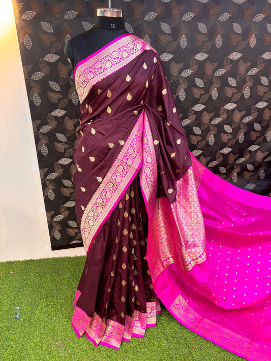 Dark Wine Pure Katan Kadhiyal Boota Banarasi Handloom Saree