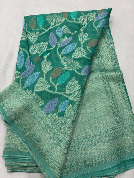 Green 1st Copy of Pure Khaddi Georgette Banaras Handloom Sari