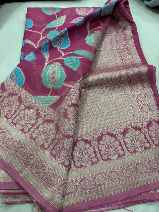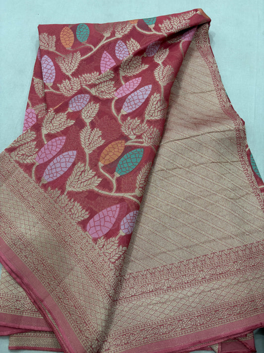 Onion Pink 1st Copy of Pure Khaddi Georgette Banaras Sari