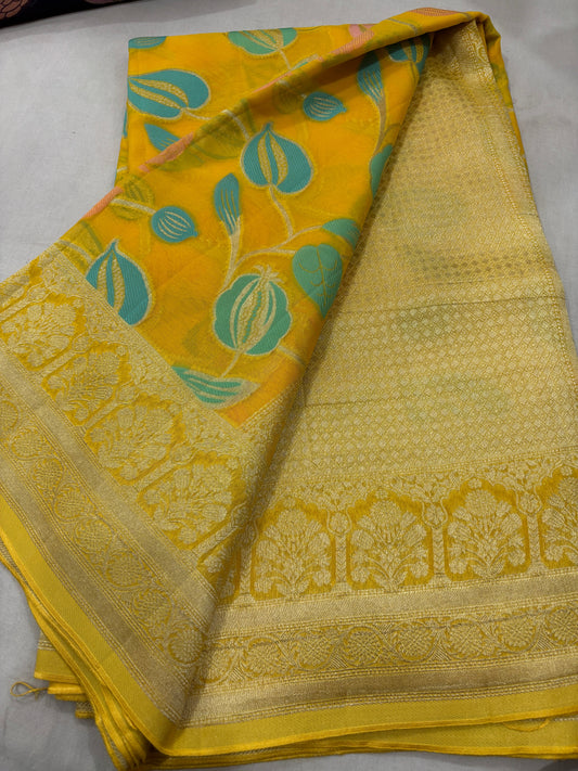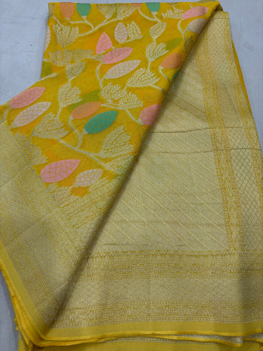 Yellow 1st Copy of Pure Khaddi Georgette Banaras Sari