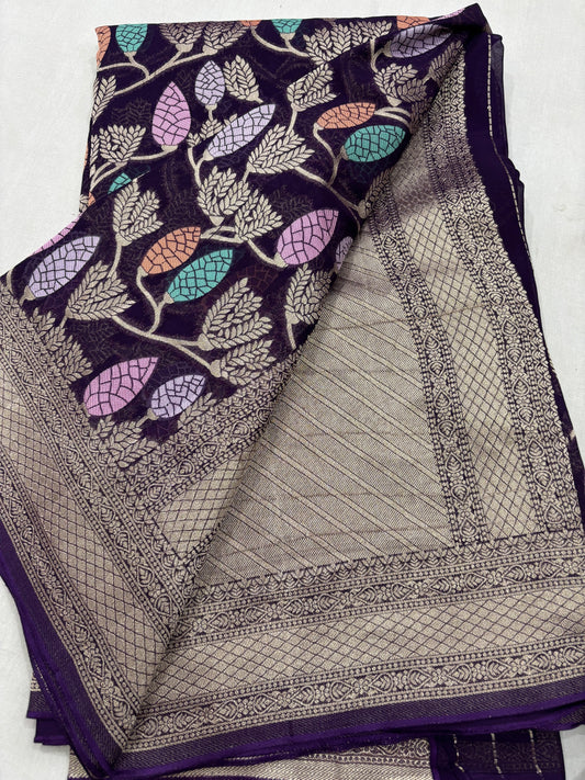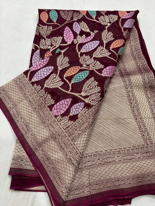 Wine 1st Copy of Pure Khaddi Georgette Banaras Sari