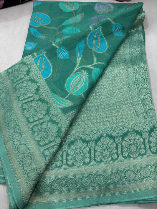 Green 1st Copy of Pure Khaddi Georgette Banaras Sari