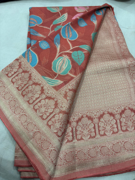 Carrot Pink 1st Copy of Pure Khaddi Georgette Banaras Sari