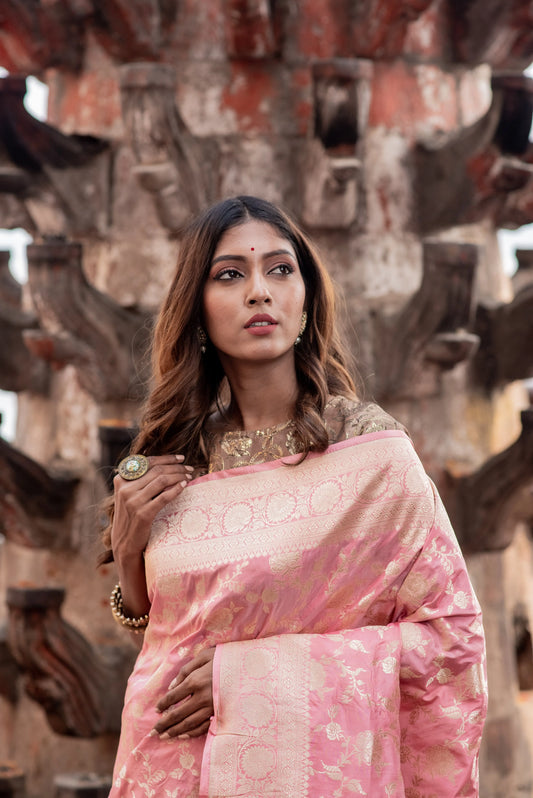 Baby Pink Pure Katan Belbooti with Meena Border Banaras Handloom Saree