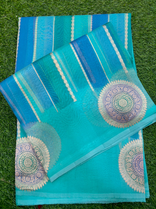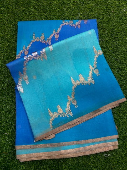 Sky blue Pure Kora Katan Rungkaat Banarasi Handloom Saree