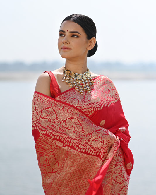 Red Pure Mashru Kadhiyal Booti Banaras Handloom Saree