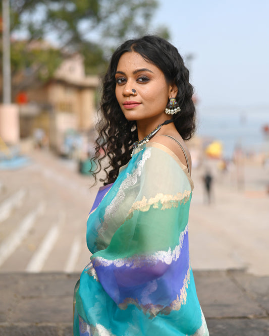 Sea Green Pure Kora Tissue Rungkaat Banaras Handloom Saree