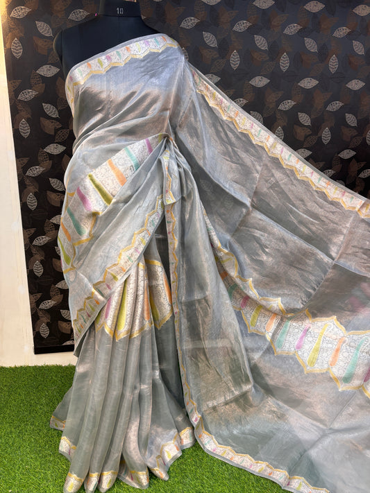 Gray Pure kora Tissue Rungkaat Banarasi Handloom Saree