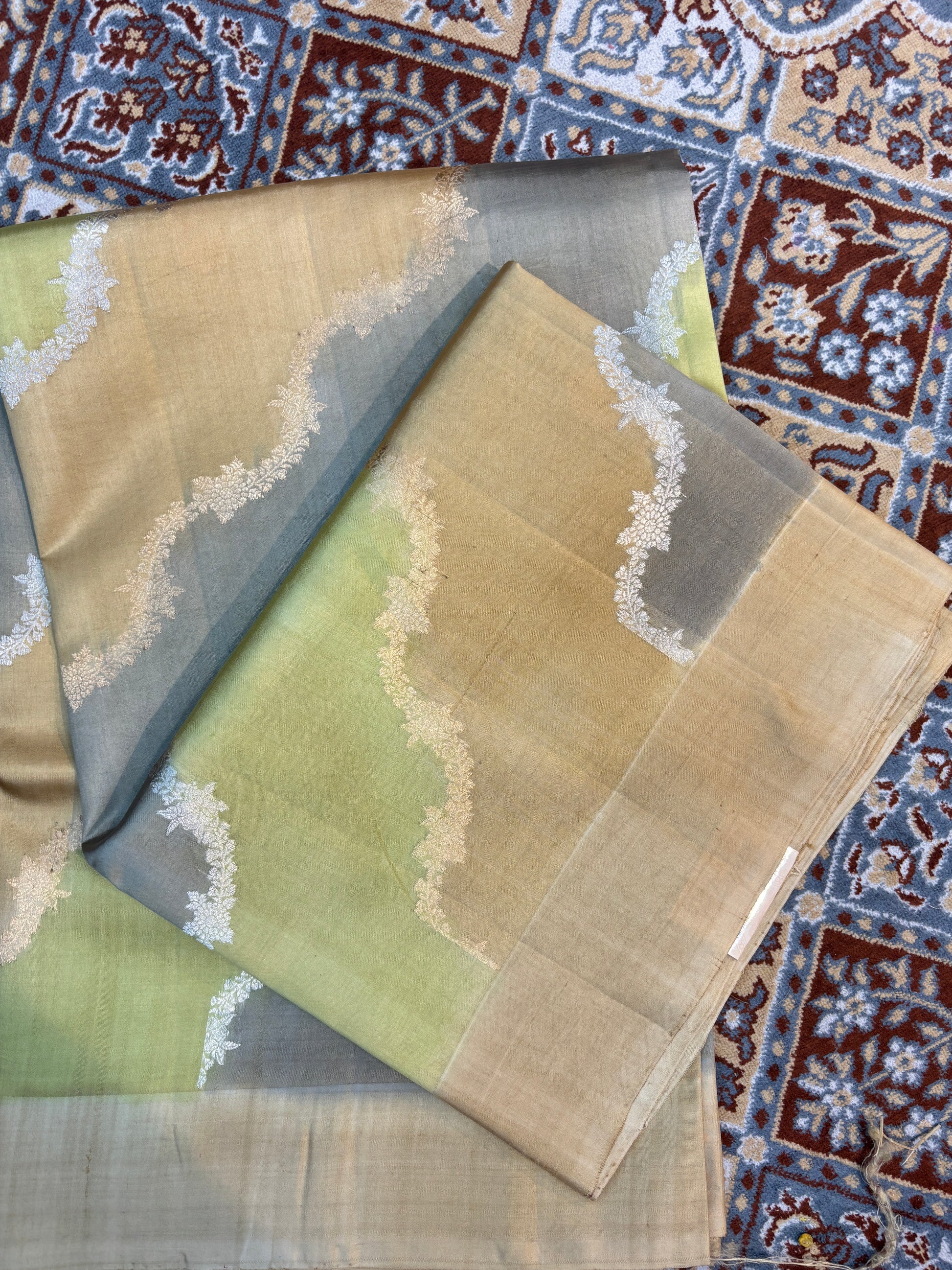 Green Gray Pure Raw Mango Rungkaat Banarasi Handloom Saree