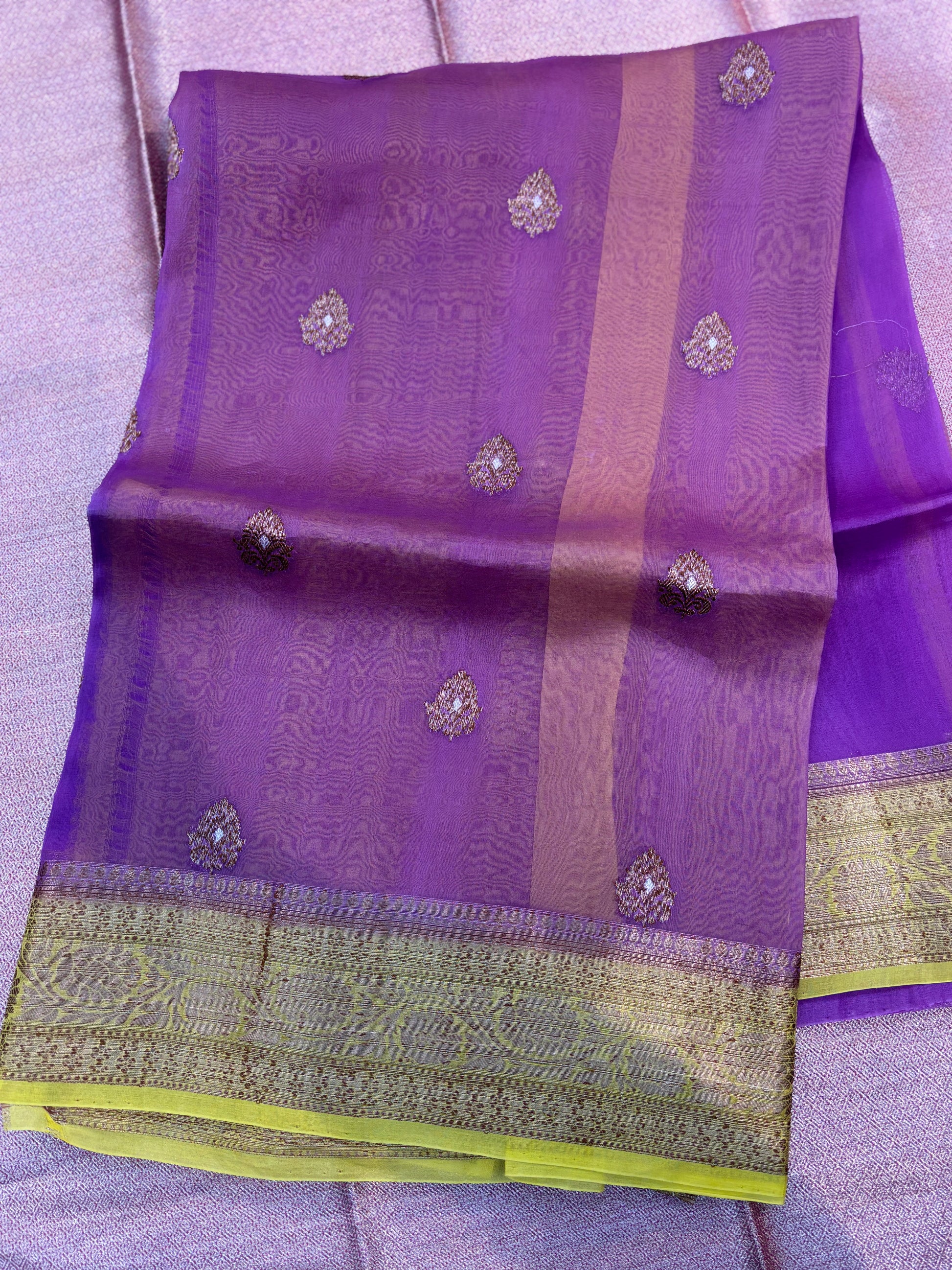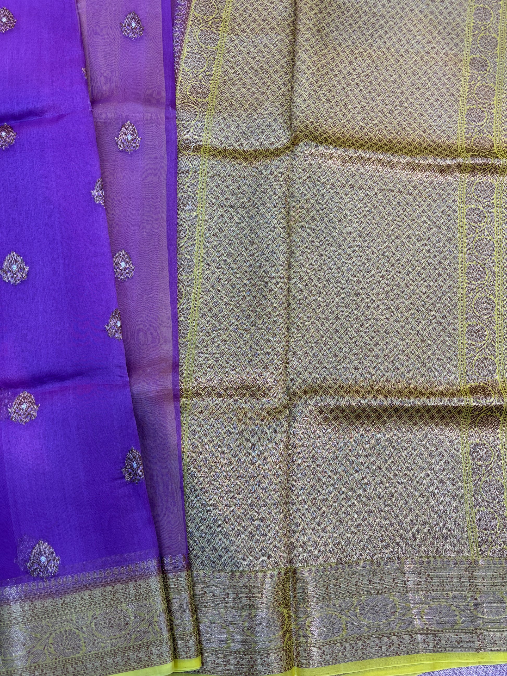 Violet with lemon, yellow, pure Kora antique Zari Banarasi Handloom Saari
