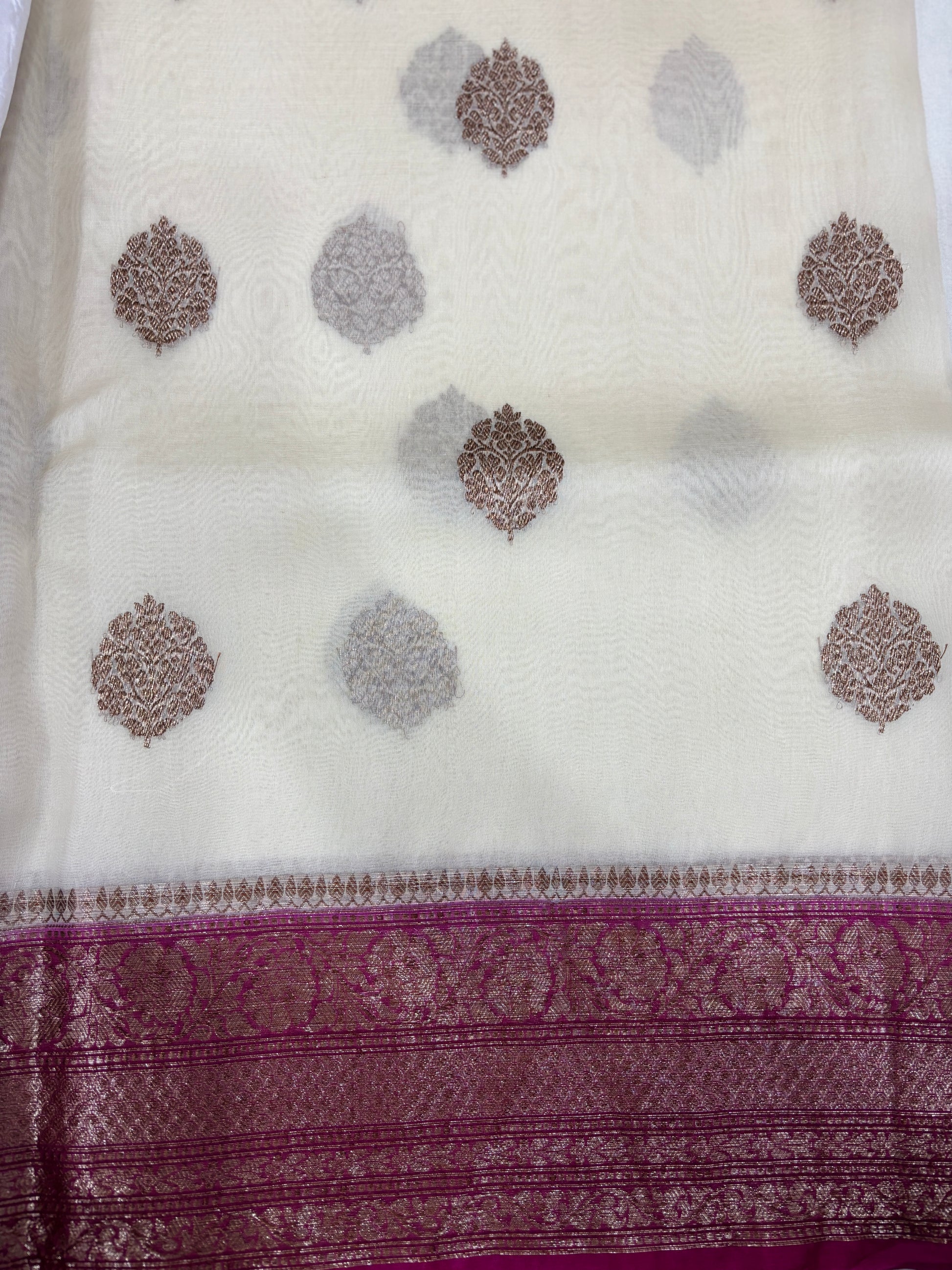 White with Pink Border Pure Kora Antique Zari Banarasi Handloom Saree