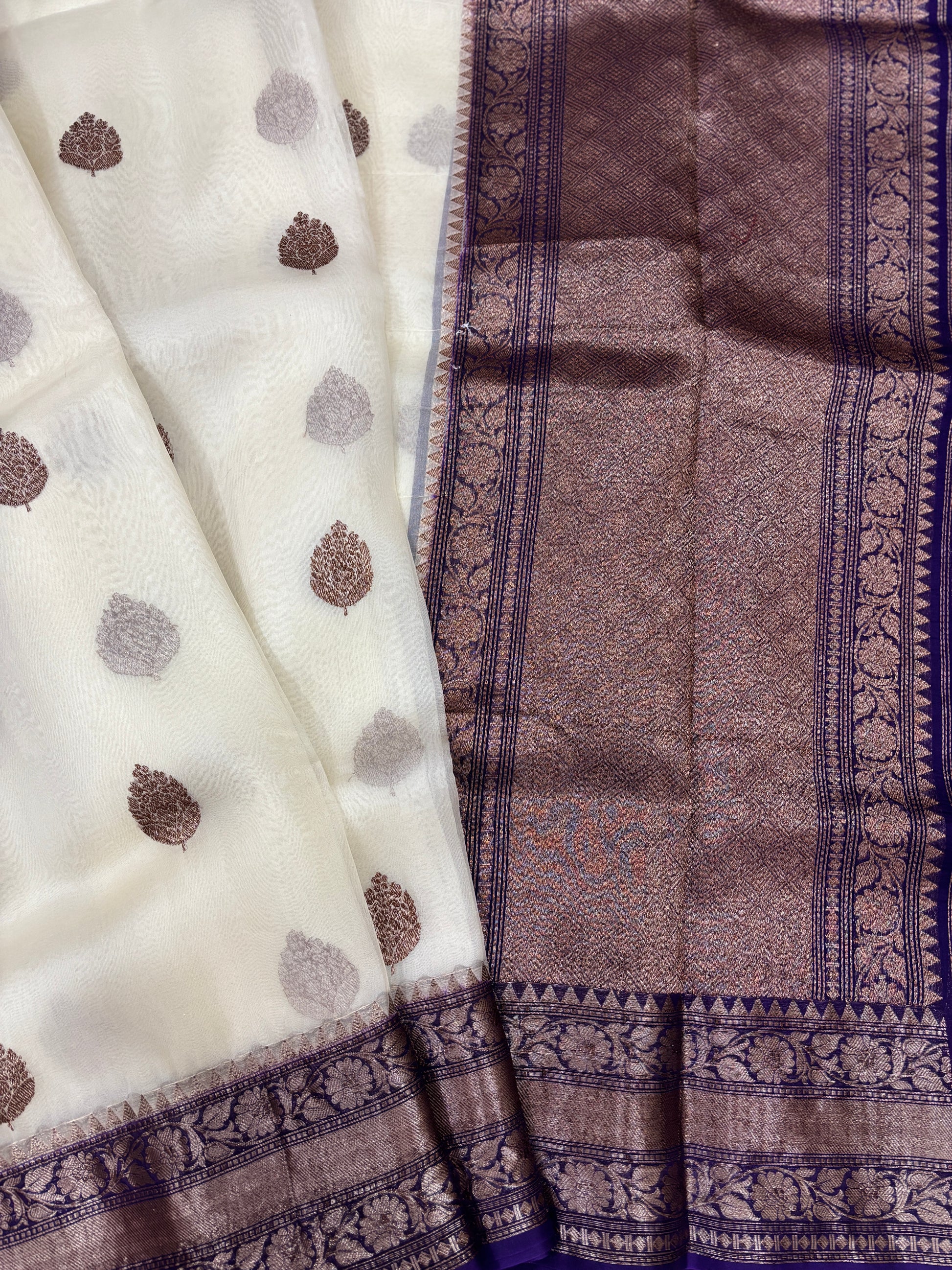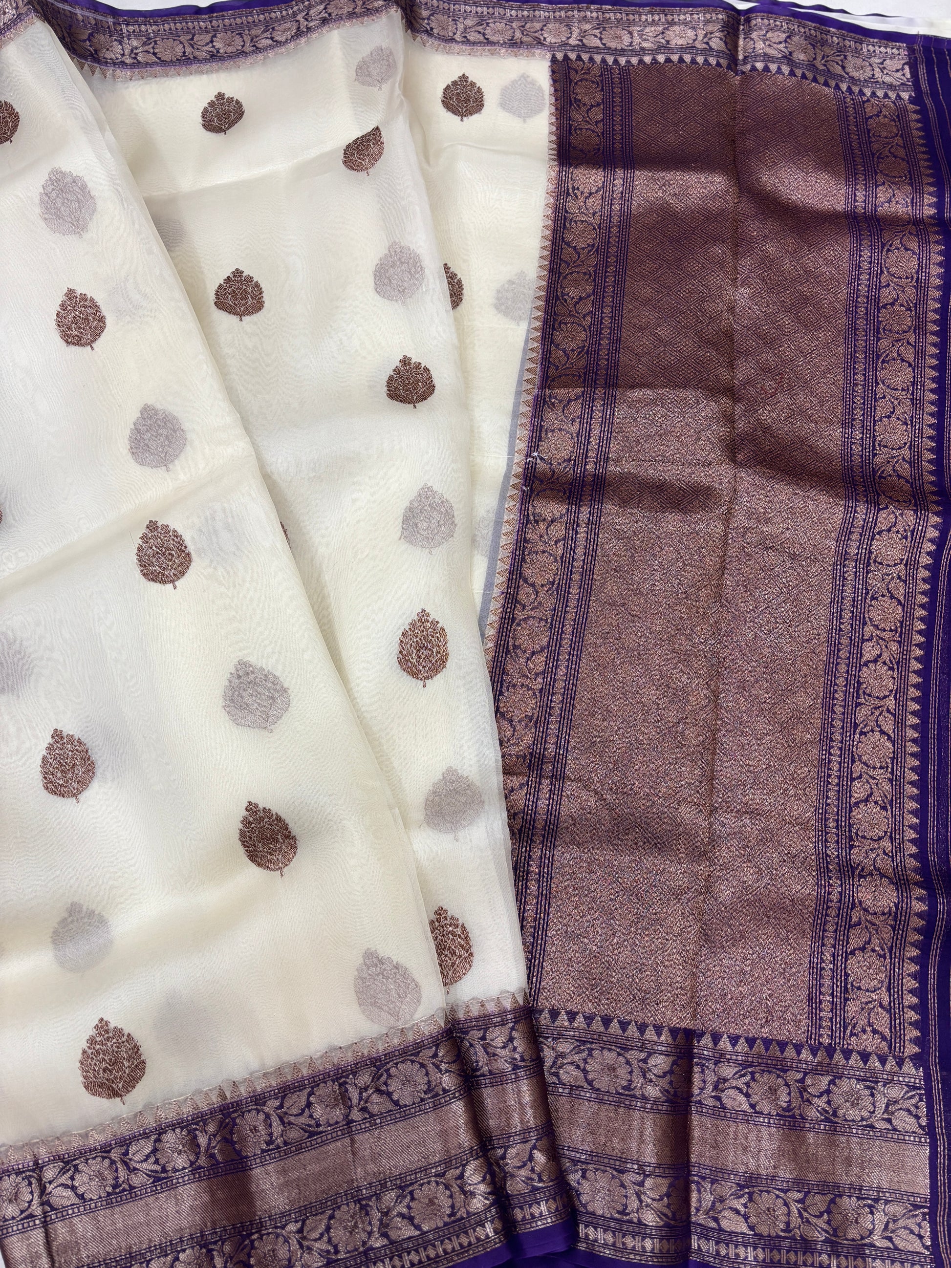 White With Blue Border Pure Kora Antique Zari Banarasi Handloom Saree