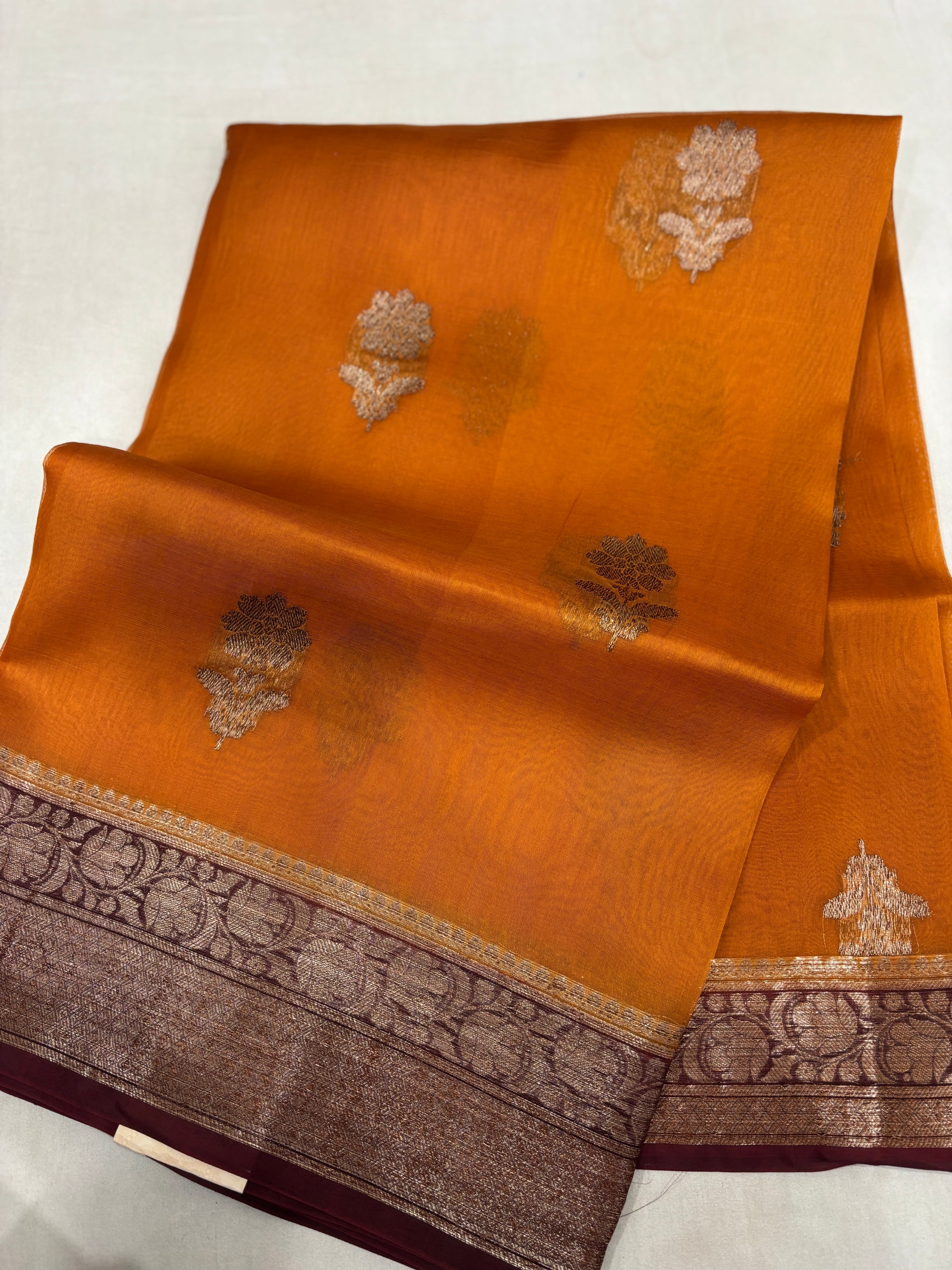 Yellow with brown border, pure Kora Antique Zari, Banarasi Handloom sari